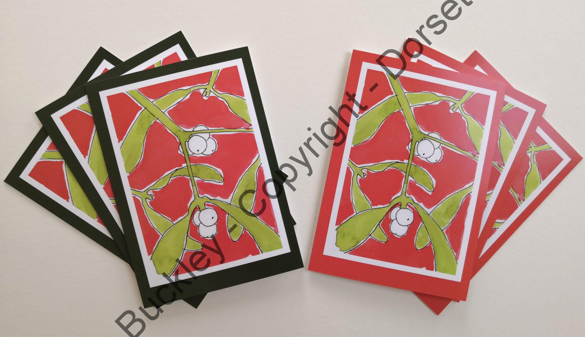 A pack of six Mistletoe Christmas cards with envelopes, three with a red border and three with a green border.