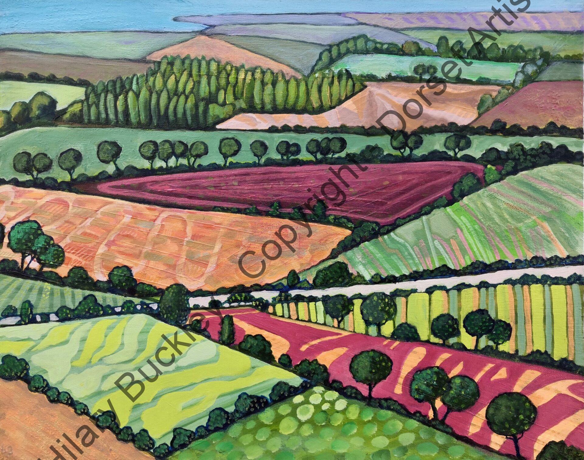 Looking down over the colourful patchwork of fields towards the sea in the distance.