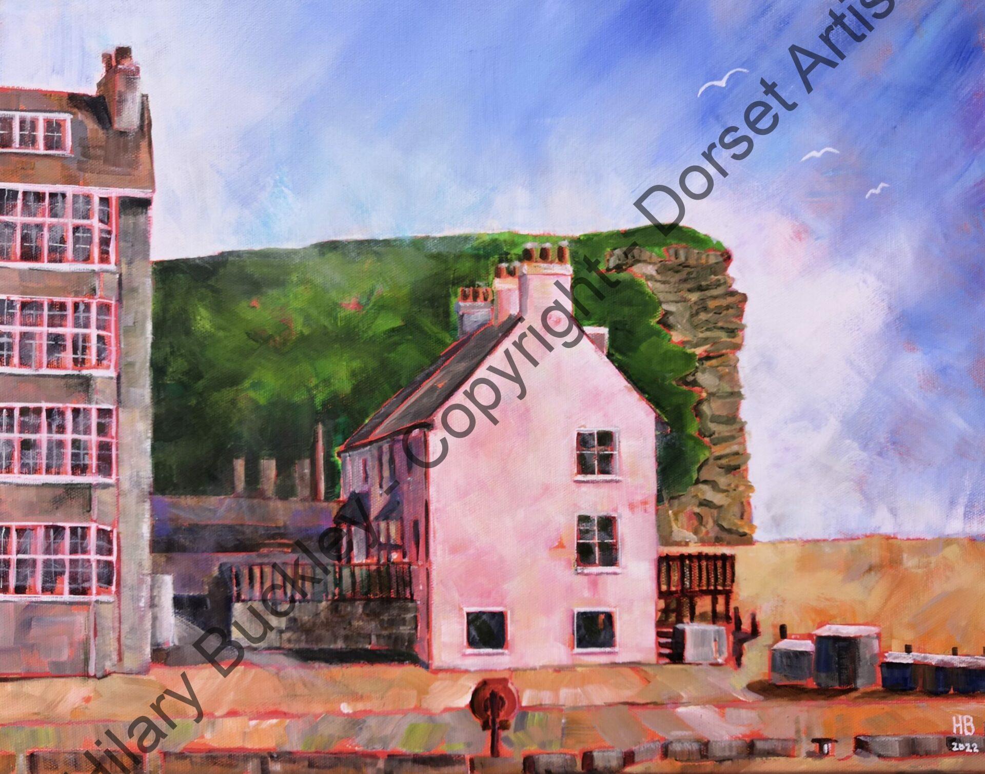 Looking towards the Pink House at West Bay, with East Cliff in the background