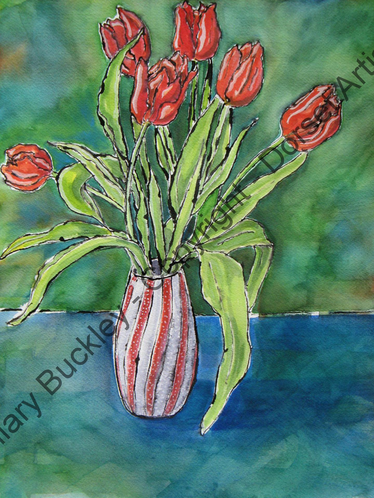 A still life with Red Tulips and a green background