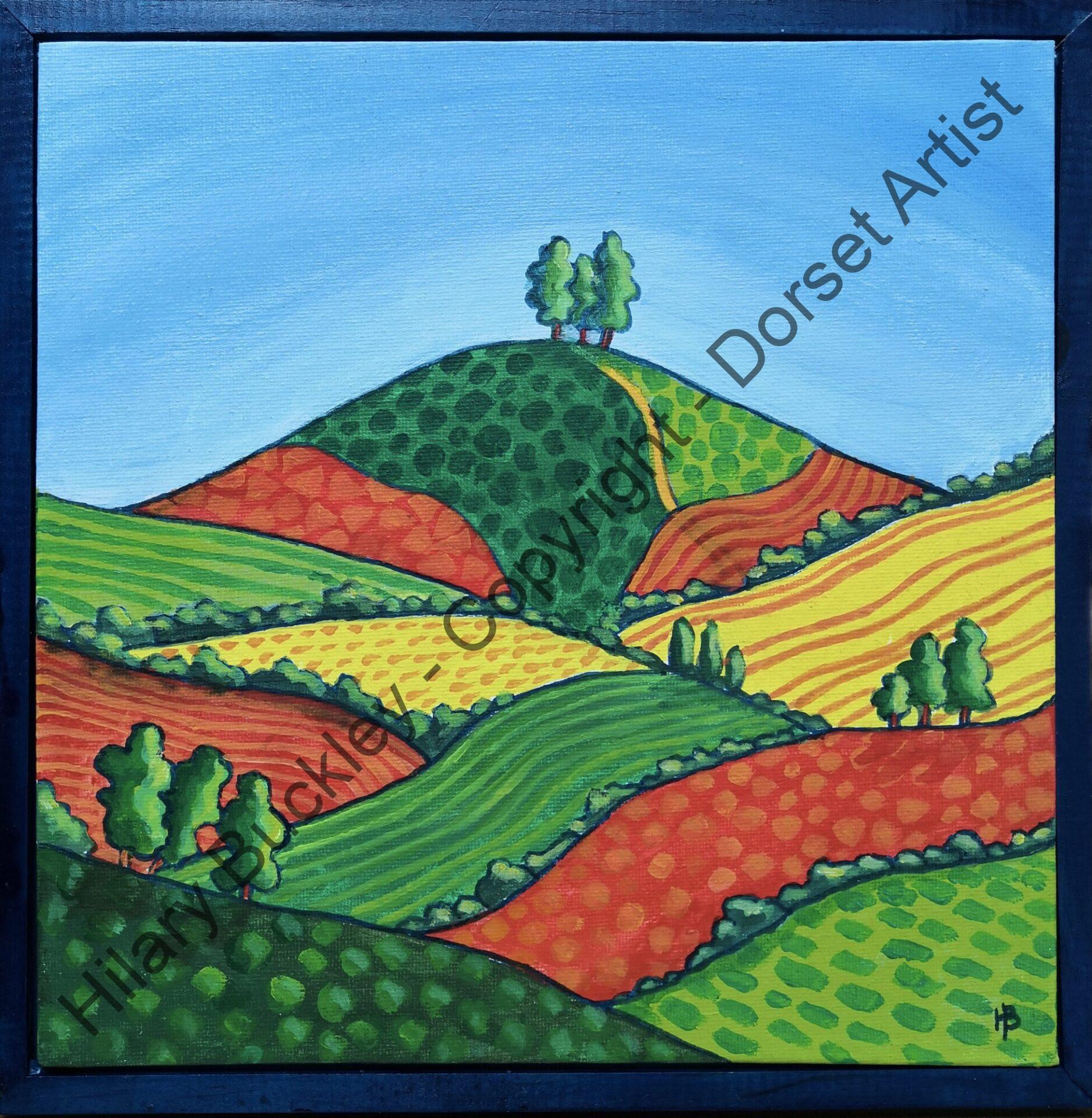 A colourful stylised version of the iconic Colmer's Hill and the surrounding fields.