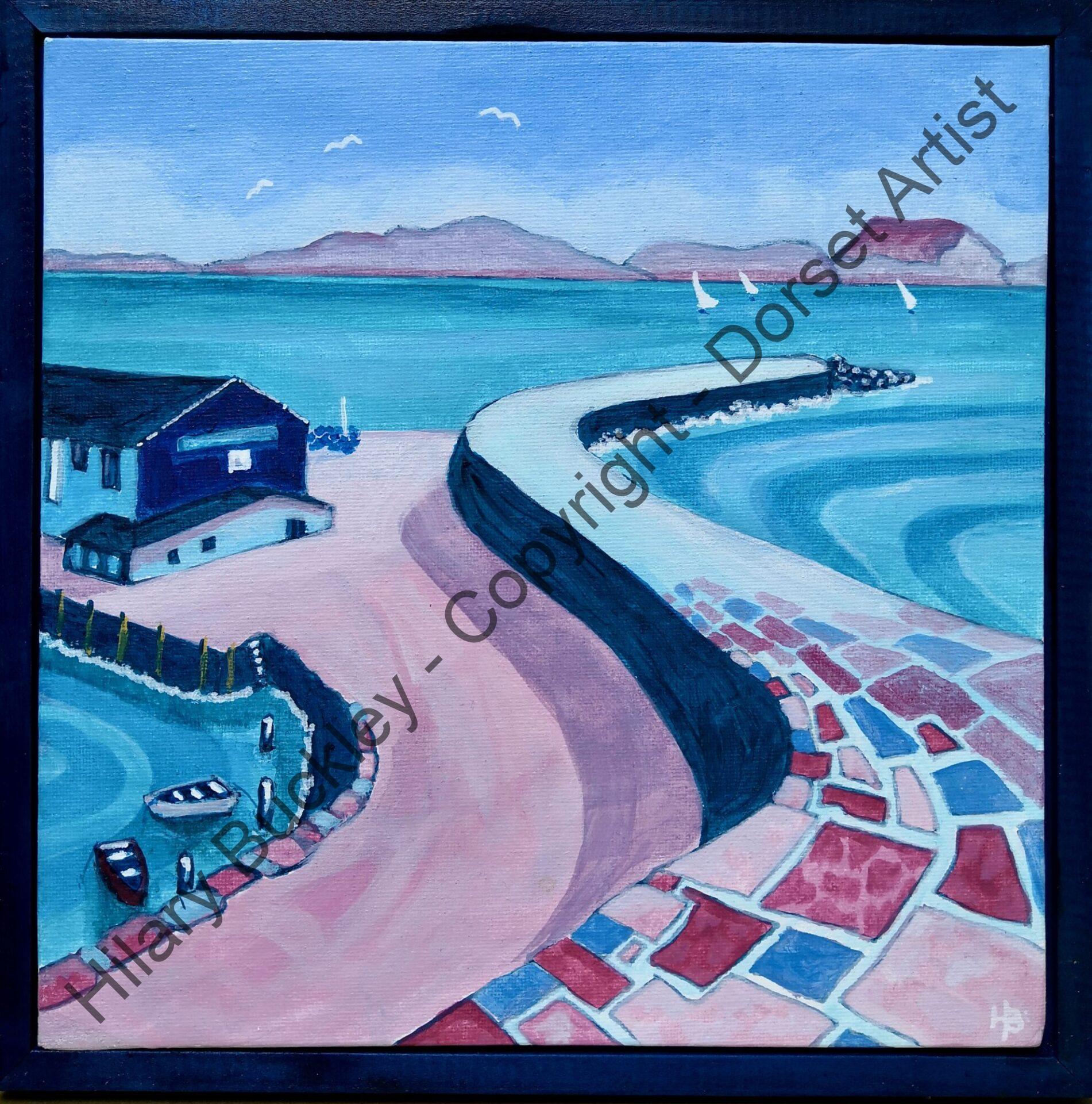 Acrylic on canvas board with approx 28xm x 28cm thin dark blue painted wooden frame.
