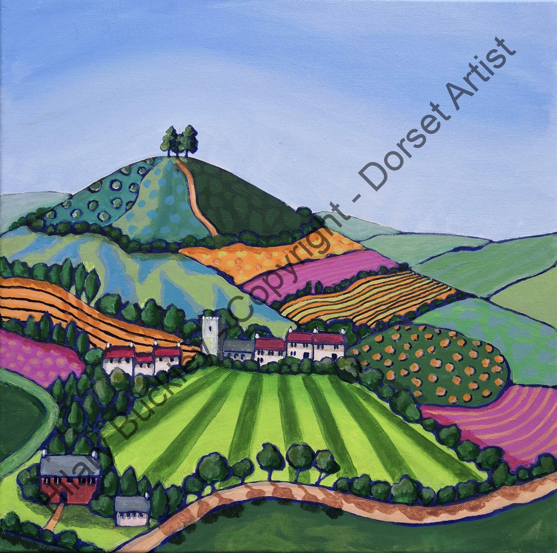 A colourful view across the fields and Symondsbury to Colmer's Hill.