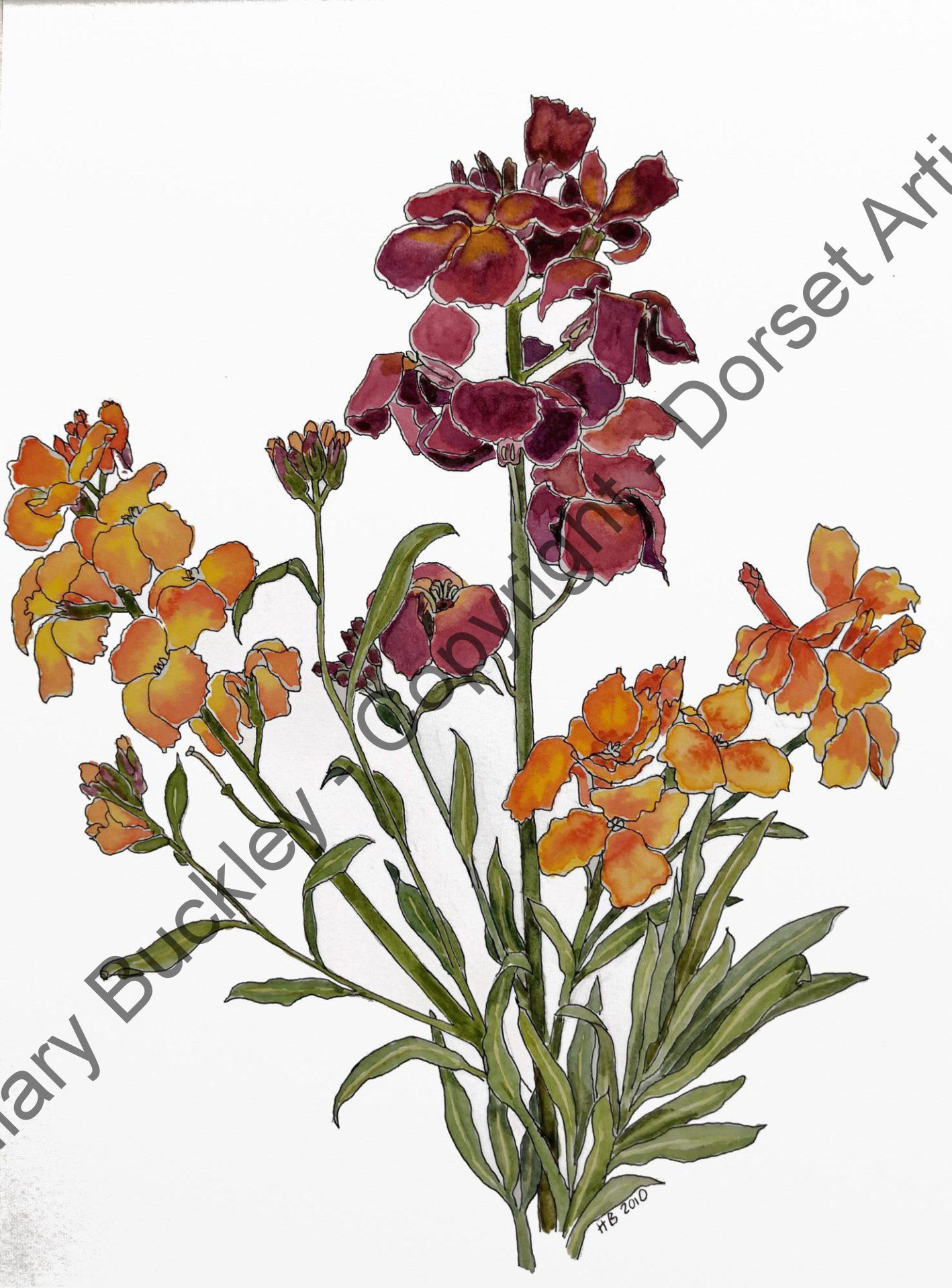 A watercolour and pen-and-ink painting of some colourful wallflowers, so welcome in the spring garden.
